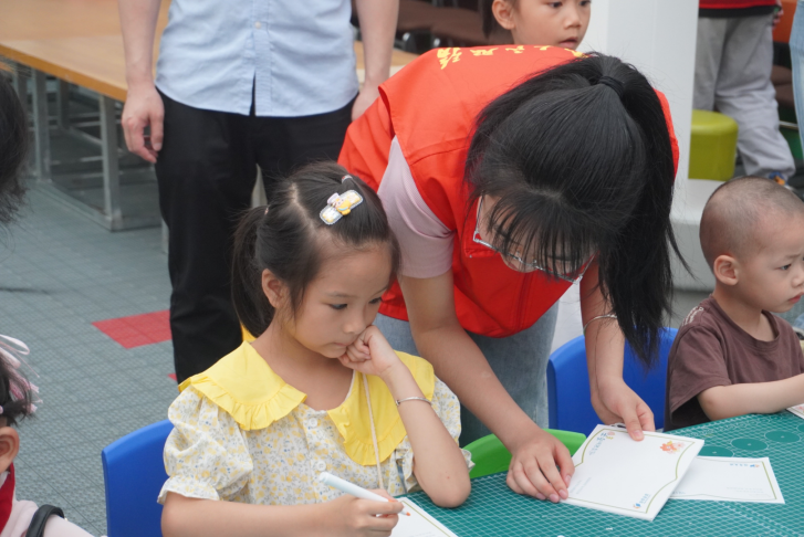 本次活动以“绘享童年,相伴成长”为主题,共分为志愿者分享绘本和小读者书写读后感两部分。活动开始,志愿者覃伟凤以问题引进,吸引小朋友们的兴趣,并对绘本《生日快乐》进行详细讲解,在讲解过程中与小读者们进行积极互动,带领他们走进主人公圆圆的故事,引导他们对绘本故事进行思考,学会爱与感恩,感受生活的美好,积极表达对父母的爱。接着,在书写读后感环节中,小读者们运用彩笔认真在卡片上书写、绘画自己的感想,家长与志愿者在一旁进行辅助。