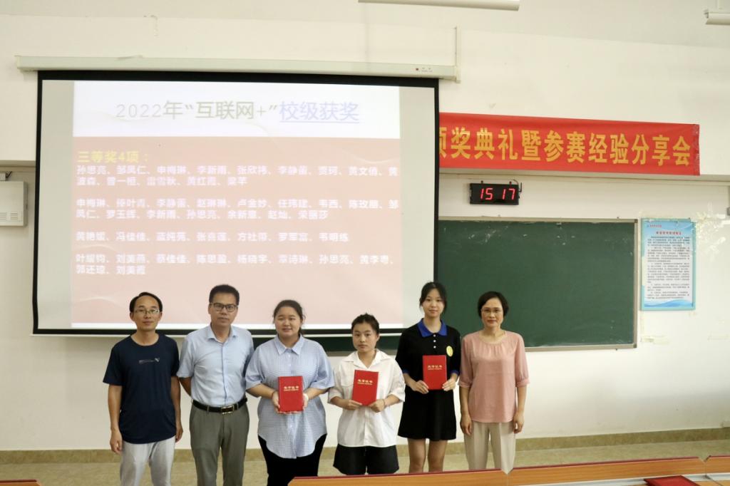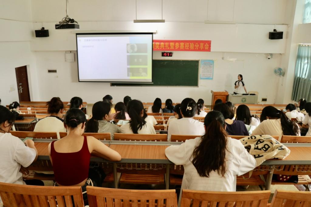 本次活动分为颁奖仪式、师生经验分析、赛事分析与总结三个部分。活动开始,周尚梅公布学科竞赛各类赛项省、校部级的获奖名单,郑立峰以及教师代表为获奖学生颁发荣誉证书并合影留念。随后,教师代表黄凯悦从历年赛况、学生参赛的主要内容类型、经验与反思三个方面来分享她的带队经验。她表明,近年来学生在技术标准和专业能力方面的不足渐渐显露,她提倡以赛促学,呼吁学生们能够理解学习真正的内涵、真正地理解学习的方法并学习积累优秀经典案例,以此夯实基础,提升专业素养能力。接着,三位学生代表分别以视频、文案、策划案三个内容类型,各自从团队运营理念、创意说明、策划思路的角度分享他们成功的经验。