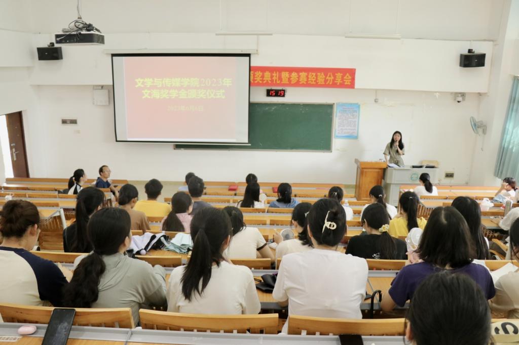 仪式开始前,庞嵘嵘介绍文海奖学金的来源、内涵、用途及设立目的。文海奖学金从2023年起由优秀毕业校友祁配文设立。“文海”以“文传院,心藏山海俯仰自在”为内涵。奖学金的设立旨在奖励道德高尚、品学兼优、乐于奉献的优秀学生,激励更多学生在德、智、体、美等方面全面发展,实现自我对学校、社会的价值。