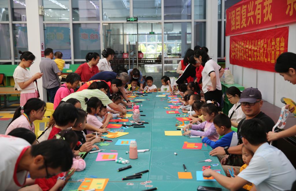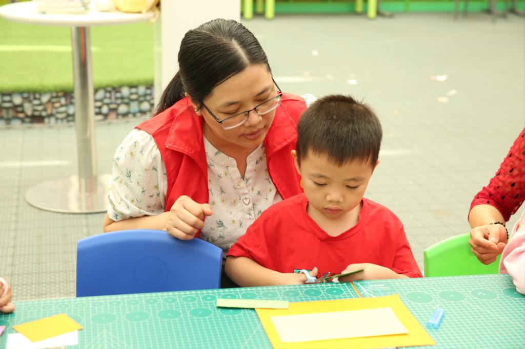 在讲解完《第一次坐公交车》绘本故事后,志愿者带领小读者们前往手工区,并将彩色卡纸和手工剪刀给小读者们。小读者们在参考志愿者做好的手工公交车后,在家长和志愿者们的协助下进行裁剪、粘贴等步骤,制作出了各具特点的手工公交车。