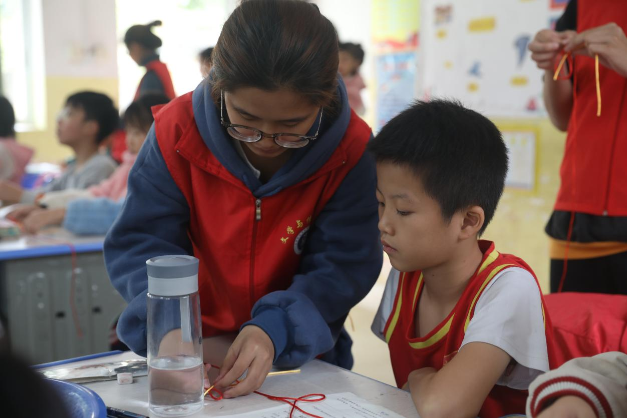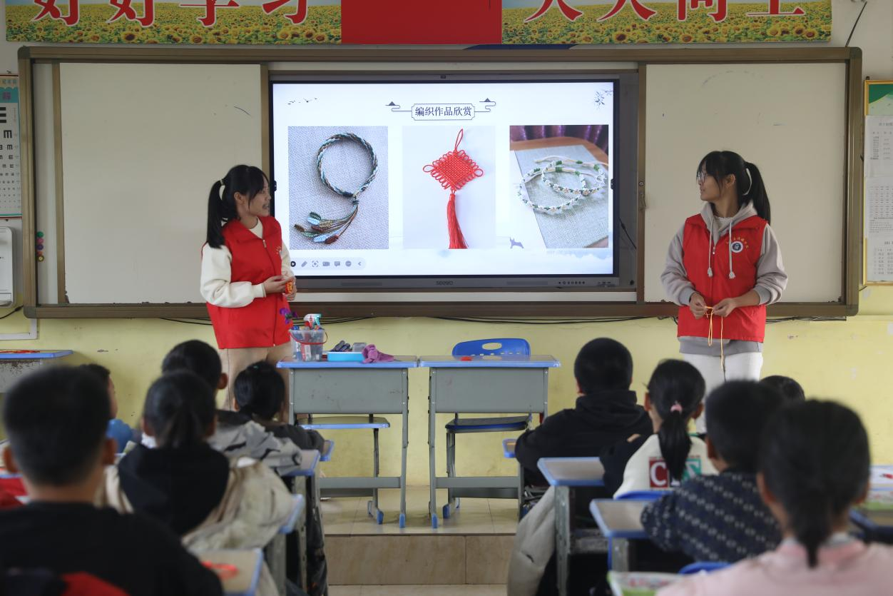 本期国学支教的授课内容以手工编织的学习为主,教学重点内容为单向平结编织。青年志愿者分别为两个教学班进行授课。课前,青年志愿者以中国结为导入内容,为小朋友们展示了各种编织作品的图片,激发小朋友们的兴趣和热情。