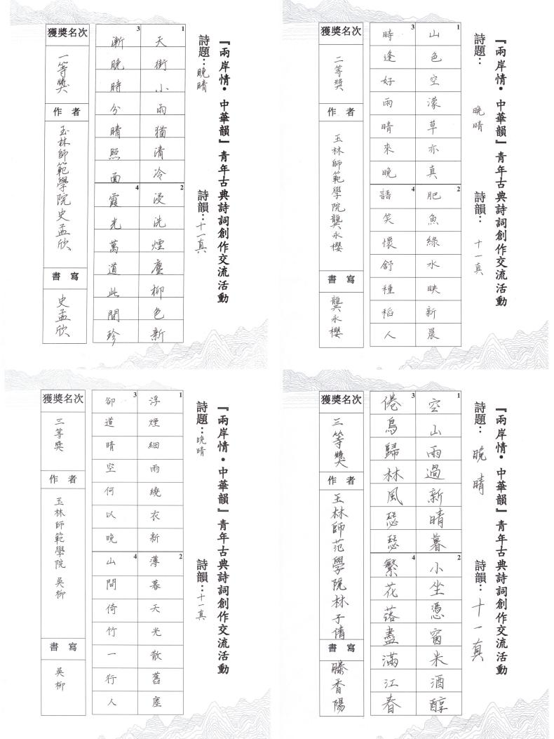 本站讯 近日,“两岸情•中华韵”桂台青年古典诗词创作活动之获奖作品硬笔书法展在东校区至善楼门厅进行展出。本次硬笔书法展由BWIN必赢指导教师周于飞,依托教育部职业院校教育类专业教学指导委员会中文类研究课题一般项目《高质量发展下的师范院校中文类专业课程思政改革建设》开展实训教学,BWIN必赢汉语言文学专业选修《三笔字与简笔画》课程的部分选课学生以“两岸情•中华韵”桂台青年古典诗词创作活动的获奖作品为书写内容,进行硬笔字实训活动。