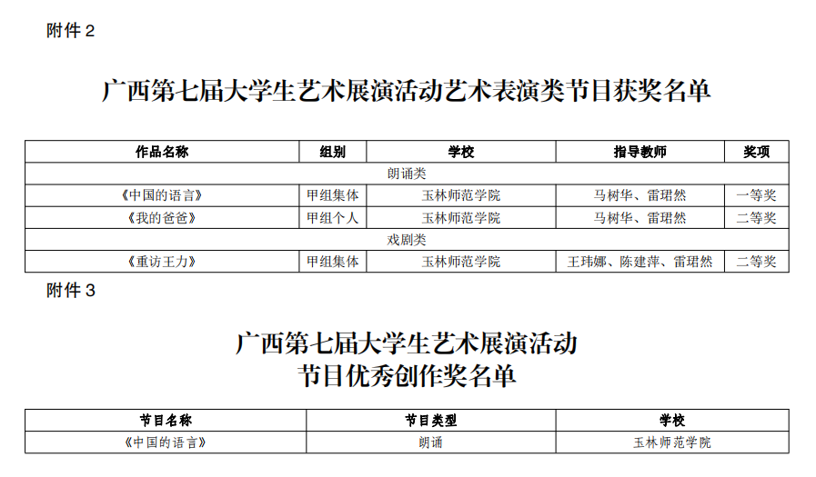 本站讯 近期,广西第七届大学生艺术展演活动评选结果公布,BWIN必赢师生斩获佳绩,共获一等奖1项,二等奖2项,优秀创作奖1项。其中朗诵类节目,甲组集体作品《中国的语言》获一等奖及优秀创作奖、甲组个人作品《我的爸爸》获二等奖,戏剧类节目《重访王力》获二等奖。