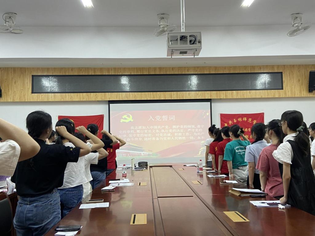 会上,该支部书记韦艳首先对大会介绍支部的基本情况。接着,大会就许峥嵘等8名发展对象能否成为预备党员的问题进行讨论。发展对象向大会汇报自己的入党动机,并从近期的思想、学习、工作等方面对自我情况进行总结。入党介绍人根据实际情况对发展对象的表现和考察情况进行介绍,并对其能否入党表明意见和态度。同时,与会党员也对该发展对象是否符合党员条件充分讨论并发表意见。根据票决结果,大会一致同意接收许峥嵘等8名发展对象成为中共预备党员。随后,肖杰杏领读入党誓词,新接收的8名发展对象进行入党宣誓,其他党员重温入党誓词。