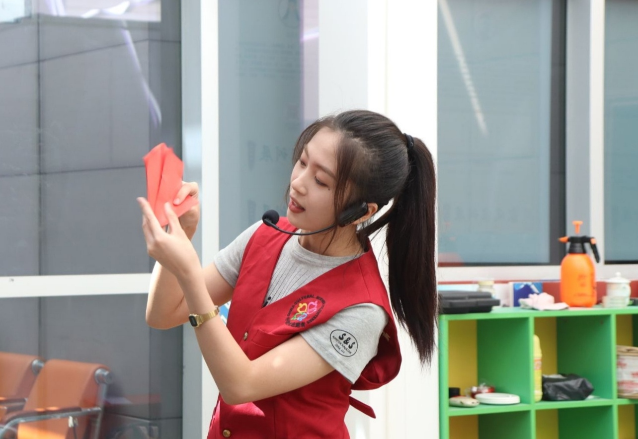 在剪纸手工体验活动中,志愿者何英蕾分步骤向小读者们讲解如何制作七一活动剪纸。小读者们踊跃参与,靠着丰富的想象力,在家长和志愿者们的协助下制作出充满童趣的红色剪纸作品。