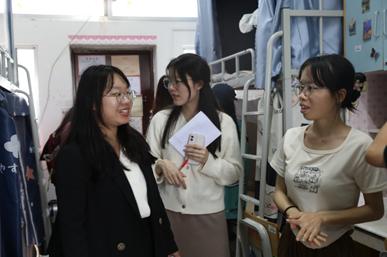 本次宿舍美化设计大赛共有15个宿舍入围,评委按顺序进入入围宿舍进行实地评分。各入围宿舍向评委详细介绍宿舍设计亮点和创意:结合专业特色设计的窗花、宿舍成员的照片墙、贴饰衣柜等。整体设计温馨、舒适、积极向上、富有个性,符合活动主题,体现了各宿舍成员团队合作精神。在评比过程中,庞嵘嵘和吕慧渝与学生们进行亲切交流,欣赏各宿舍美化成果和最美书桌,热情询问学生日常学习和生活情况,认真倾听学生们的想法。