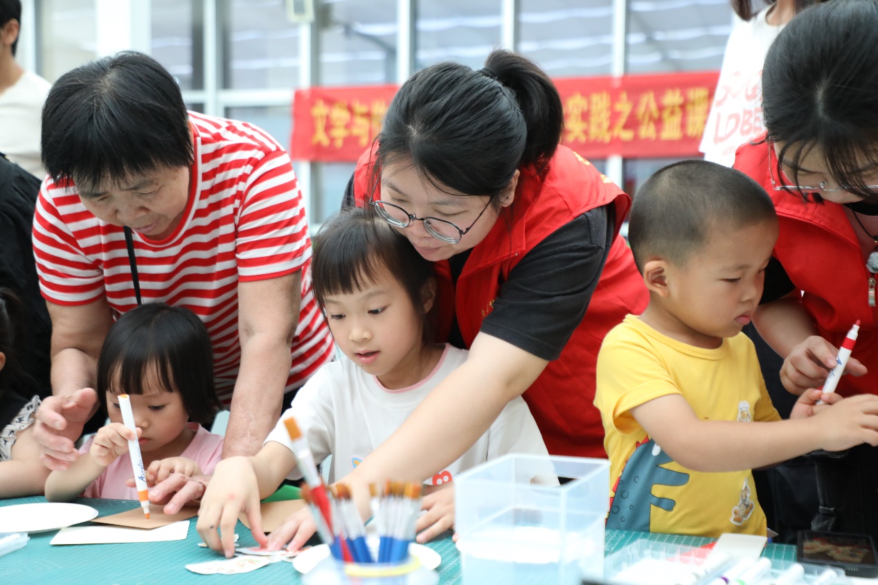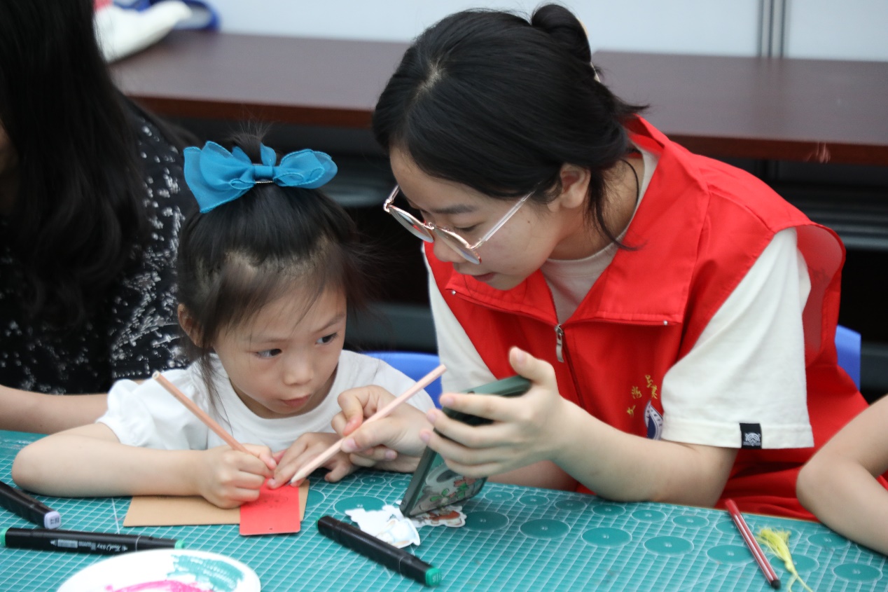 在手工制作环节中,小朋友们在家长和志愿者的协助下,利用卡纸、颜料、彩笔等材料制作出了一张张精美的书签。