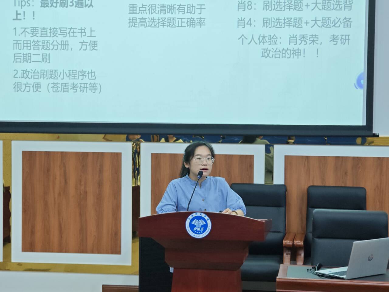 会上,各考研学生代表分别从明确院校目标、规划学习时间、补充基础知识、提升综合能力、保持身心健康等方面进行分享,建议在座师弟师妹要明确自己的考研目标,根据自身情况来制定后续的学习计划;合理分配各科目的学习时间,灵活运用碎片时间,合理安排学习任务,提高效率;重视身心健康,保持规律的作息时间,保持积极心态。