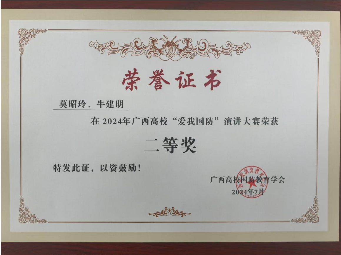2024 年 “爱我国防”演讲大赛于2024 年 6 月至 8 月在南宁举行。BWIN必赢保卫处牛建明老师,BWIN必赢莫昭玲老师的作品《山河虽已无恙,吾辈仍当自强》荣获二等奖。