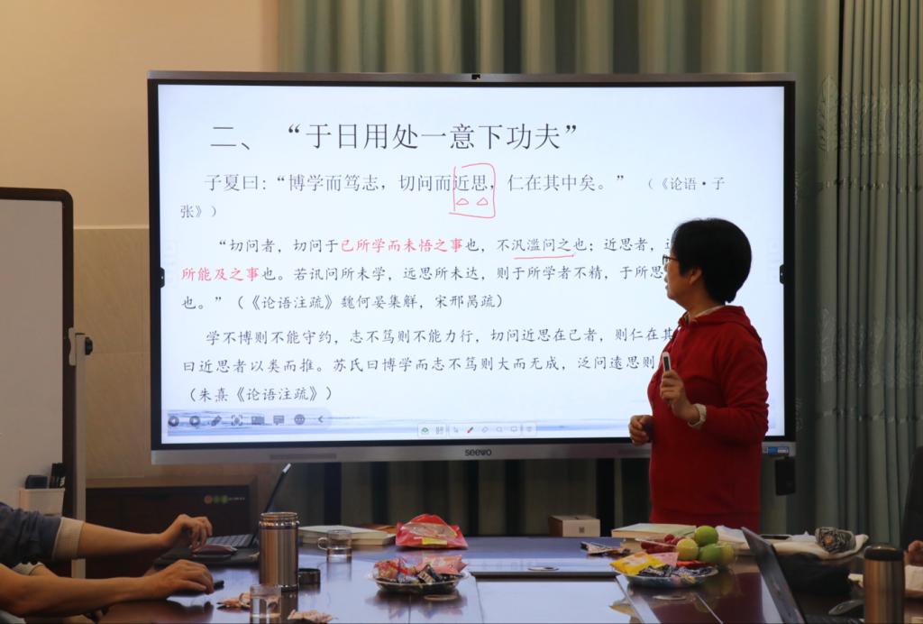 方丽萍从理学谱系中的《近思录》、“首卷难看”问题、“切问近思”的含义、“会通观与分别观”问题、经典的“没有时间性”五个方面进行分享。期间,方丽萍对《近思录》做简要介绍,通过在生活中观察到的实例分享自己对《近思录》内容的理解与感触,并结合自身阅读情况分享共通之处与所得收获。方丽萍表示,读书应做到精读、反复读、带着问题去读,坚持思考。方丽萍还从文学训练等角度出发,就《近思录》的阅读方法介绍自己的经验与看法,为师生如何阅读《近思录》提供方法指导和借鉴。最后,方丽萍呼吁学生们多读经典,在阅读中不断发现问题,读好书,好读书。