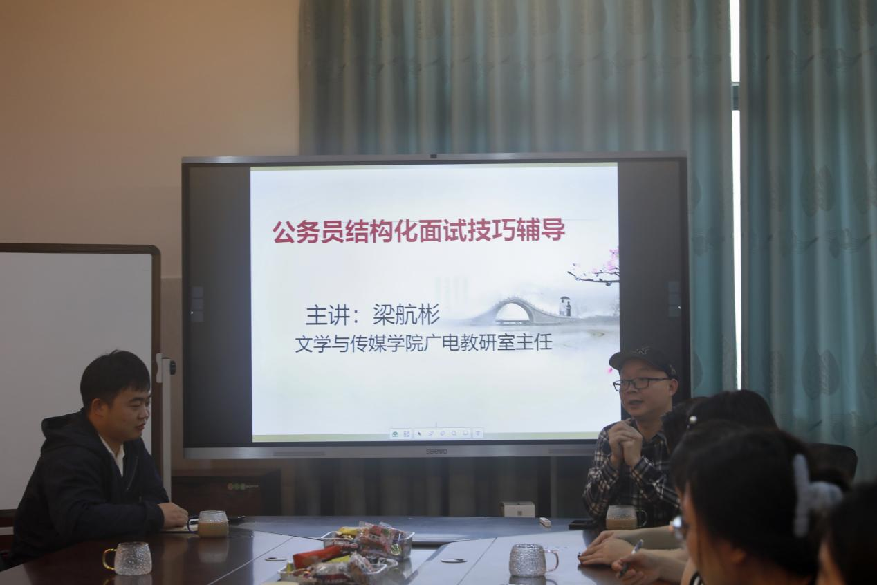 期间,梁航彬邀请同学们进行结构化面试的情境还原,并悉心指出和改正同学们的问题。同时他鼓励同学们应着重培养综合分析、组织协调、应急处置等方面的能力,以此更好地应对公务员结构化面试。最后,梁航彬向同学们讲述了公务员面试礼仪的重要性,他亲自示范如何在面试时进行礼貌、流畅、有逻辑地表达,为同学们提供了很好的学习范例。