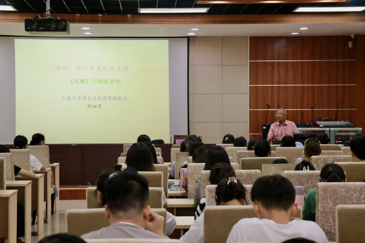 讲座上,邵炳军从《关雎》文本简析、贵族婚姻礼俗与“嘉礼”、“五礼、五伦”与“诗礼文化”三大内容向师生们详细讲解了诗礼文化。其中,他引用《礼记·乐记》中的诗句,强调了德与知礼知乐的重要性。