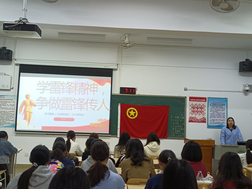 此次团日活动以“学习雷锋精神”为主要内容,学习雷锋精神围绕“有理想、敢担当、能吃苦、肯奋斗”为目标。在活动中,赖小冰介绍到雷锋精神是以雷锋的名字命名,以雷锋的精神为基本内涵,并在实践中不断丰富和发展着的革命精神,以此引出“全心全意为人民服务”的核心思想。接着,赖小冰向该班学生分享雷锋故事,她以“雷锋帮大婶买火车票”为例,讲述雷锋慷慨助人而不求回报的故事。最后,赖小冰再次号召该班学生要在实践中践行雷锋精神,而不能只落在认识层面上,更要体现在日常生活中。