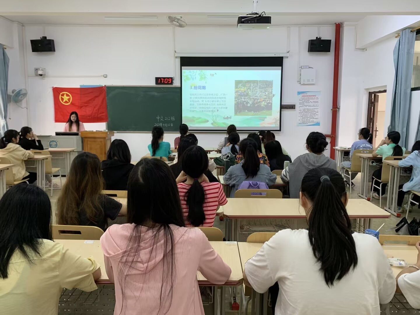 活动上,韦凯首先对“三月三”节日的由来进行详细讲解,强调此节日对于广西人民的重要性。韦凯通过展示“三月三”的节日图片来介绍赶歌圩、抢花炮、绣球传情等活动及活动的具体流程,并分享节日期间的热门美食。紧接着,韦凯组织学生采用抢答的形式进行民族文化知识竞赛,加深学生对节日基础知识的理解。随后,学生代表周慧潇就优秀壮族“三月三”主题做演讲,分享收获和感悟,并呼吁学生要热爱壮乡文化,传承优良传统。最后,韦凯组织学生朗诵诗歌《56个民族》并合影留念。
