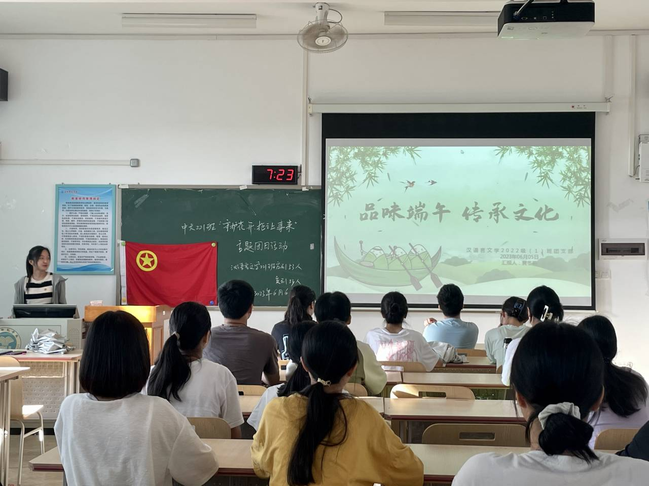 黄冬莉围绕节日概述、节日习俗、节日饮食、文化影响四个方面展开讲述。首先,黄冬莉向学生们介绍了端午节的由来,让学生们对端午节文化有基本的了解。在个人演讲环节,该班学生代表李晓濛、阮巧敏上台发言,分享了自己关于端午节的切身体会。接着,黄冬莉组织开展小游戏“比比谁更会说”,以趣味性的互动引导学生们更加积极地参与到对端午节文化的学习中。此外,黄冬莉还组织全体学生共同观看了端午节相关的宣传视频,更加直观地向学生们展示了端午节中蕴含着的文化内涵。最后,黄冬莉强调端午节的文化影响,呼吁大家在今后的学习和生活中更加主动地去学习传统节日文化知识和体验节日习俗,增强民族文化认同感。